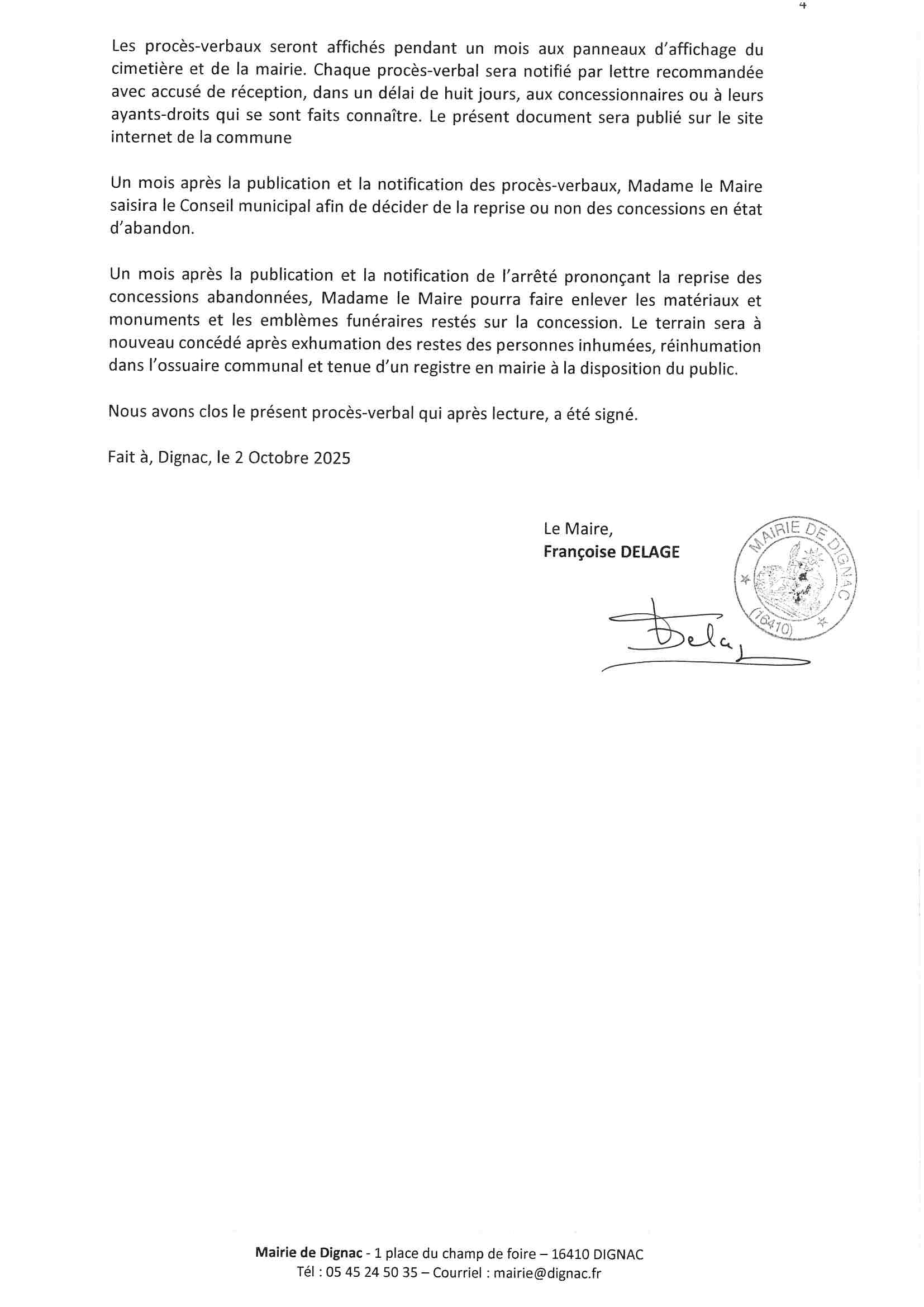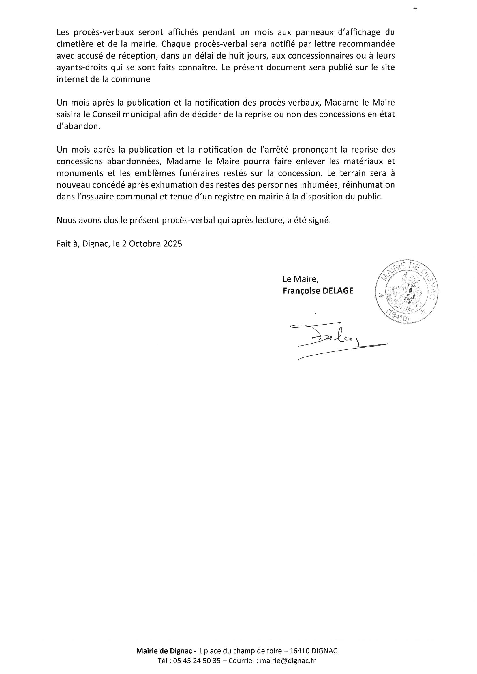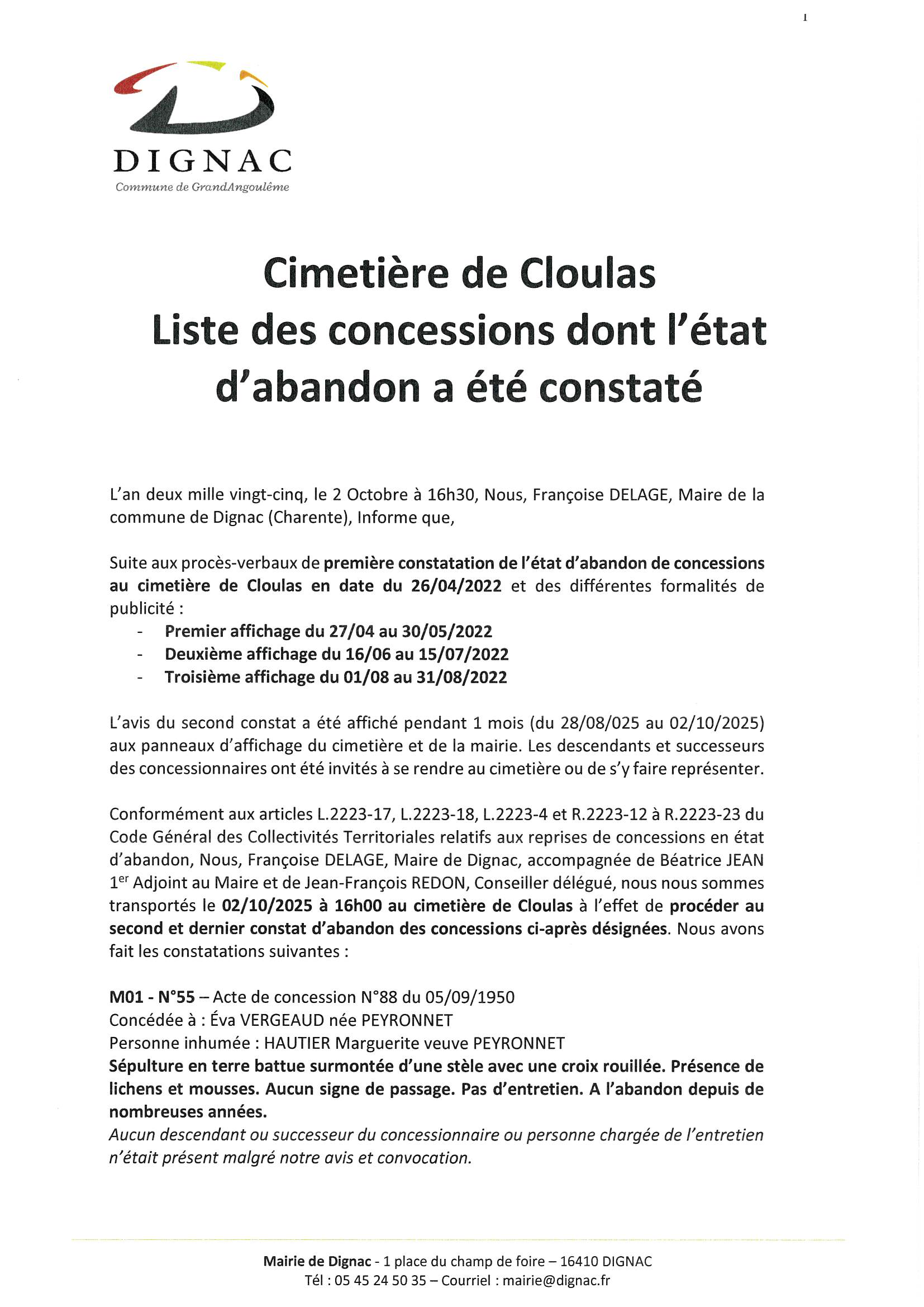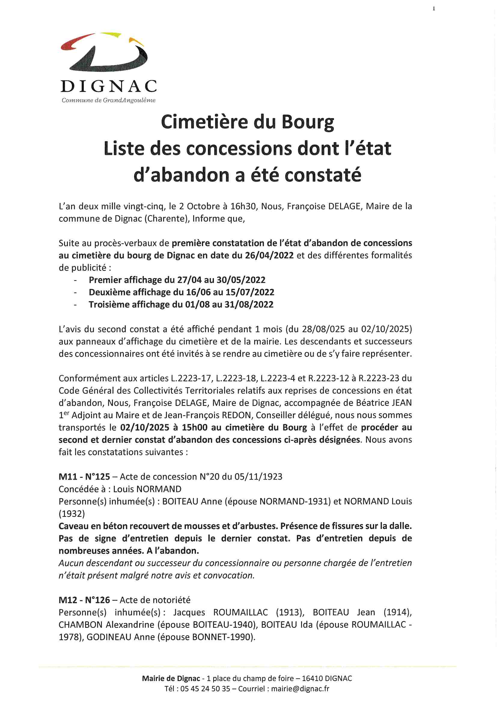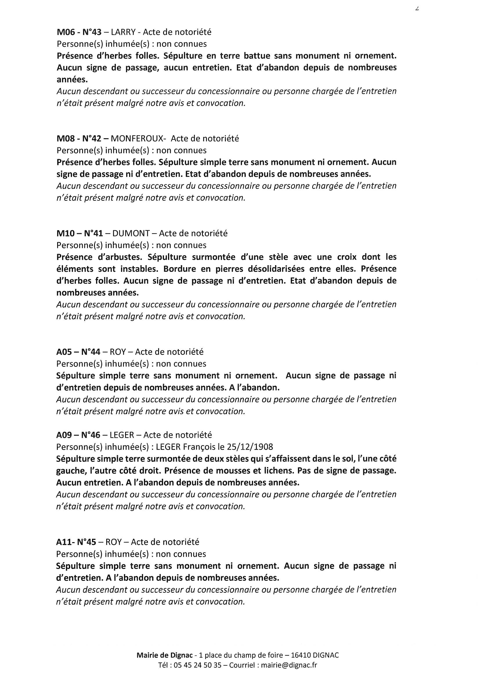 Cimetière du bourg de Dignac liste des concessions dont l’état d’abandon a été constaté lors d’un second constat le 02/10/2025