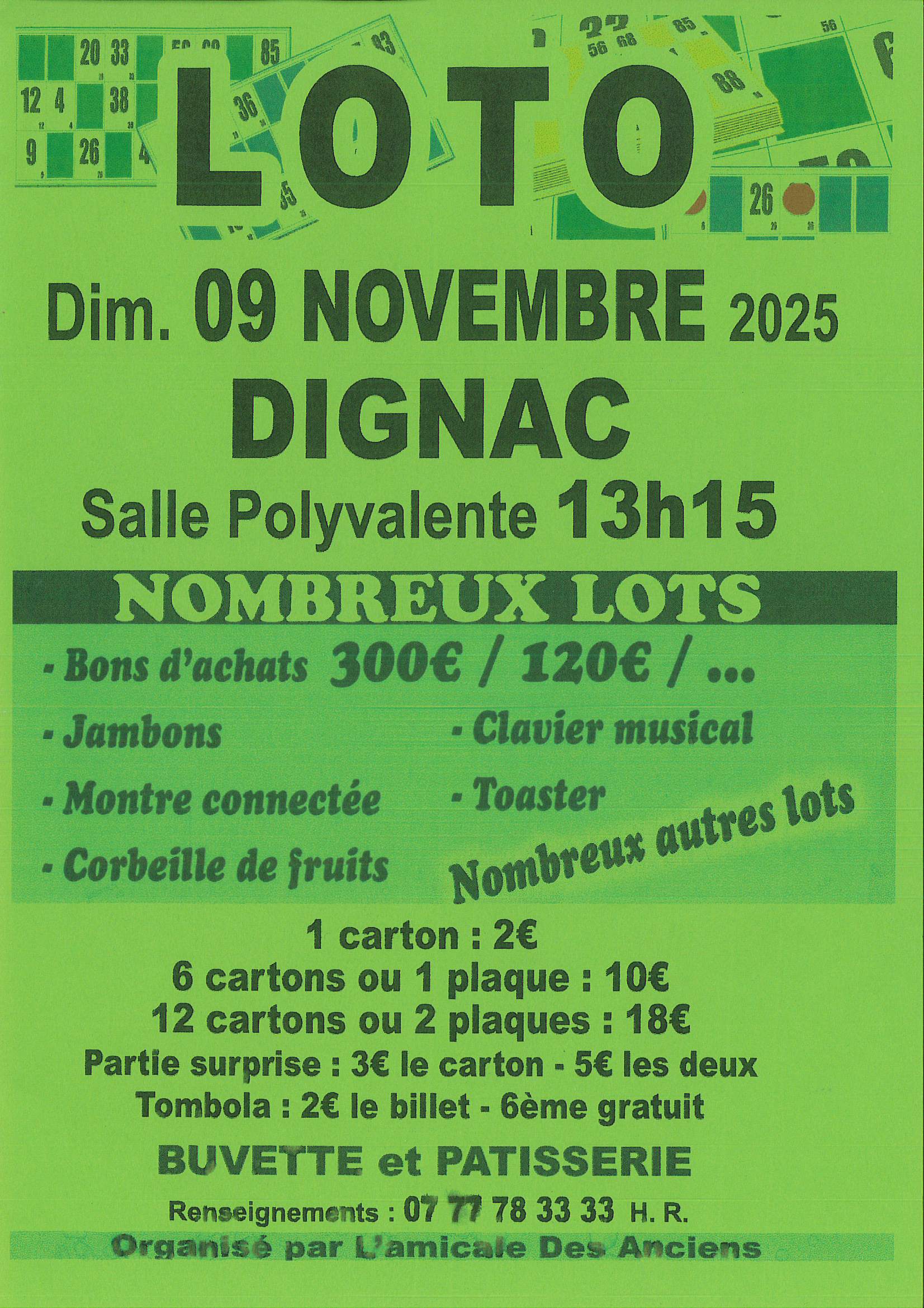 13 h 15 min - 18 h 30 min 09/11 13h15 Loto Amicale des Anciens 9 novembre à 13 h 15 min - 18 h 30 min 09/11 13h15 Loto Amicale des Anciens