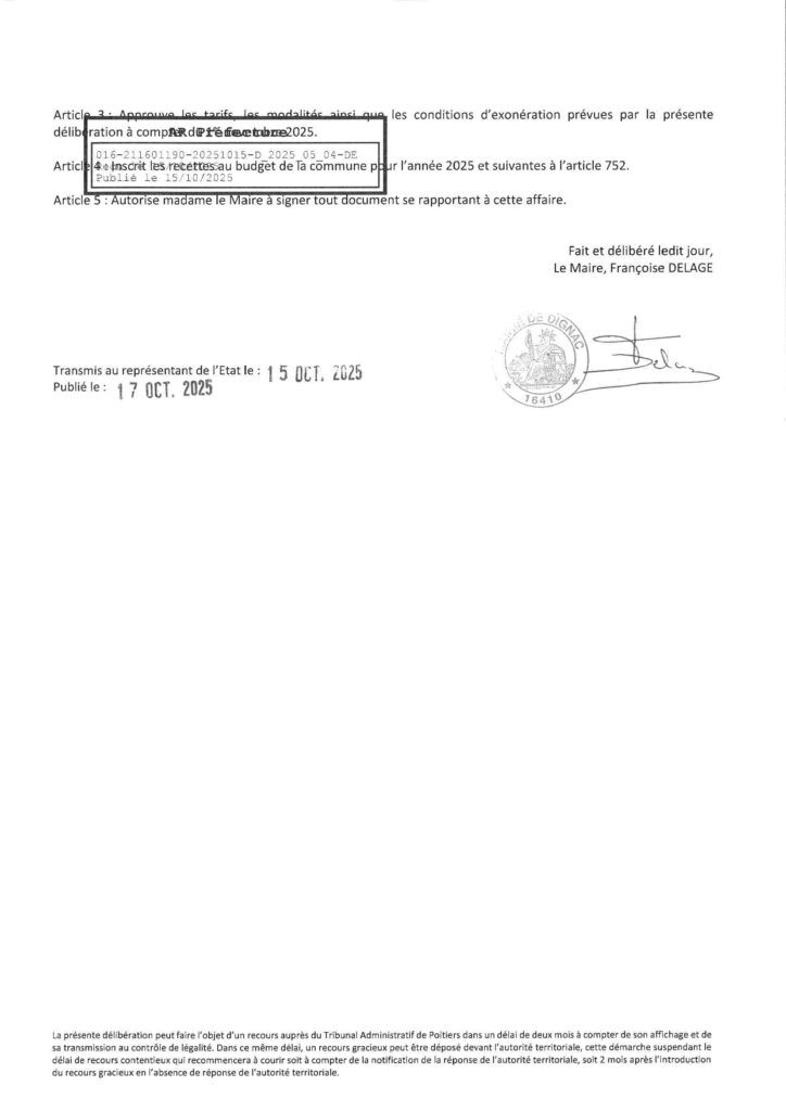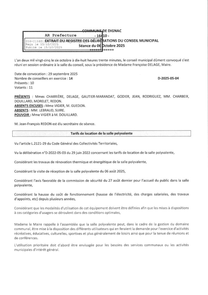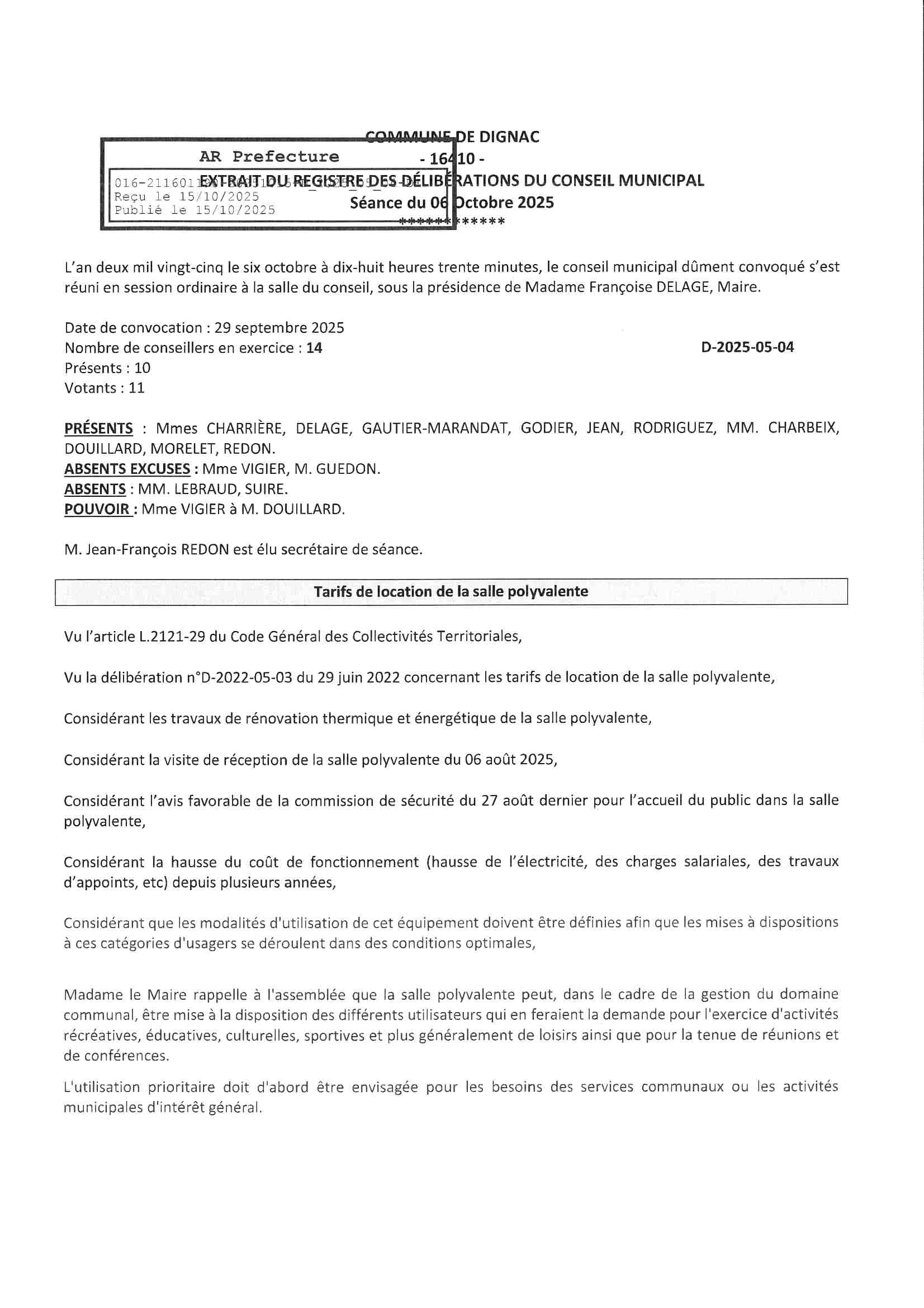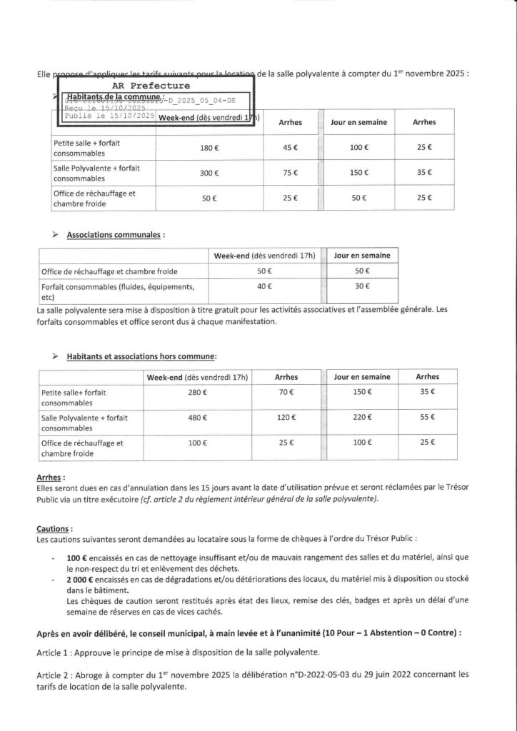 1 -TARIFS DE LOCATION DE LA SALLE POLYVALENTE à compter du 01/11/2025 (délibération du Conseil Municipal du 06/10/2025)