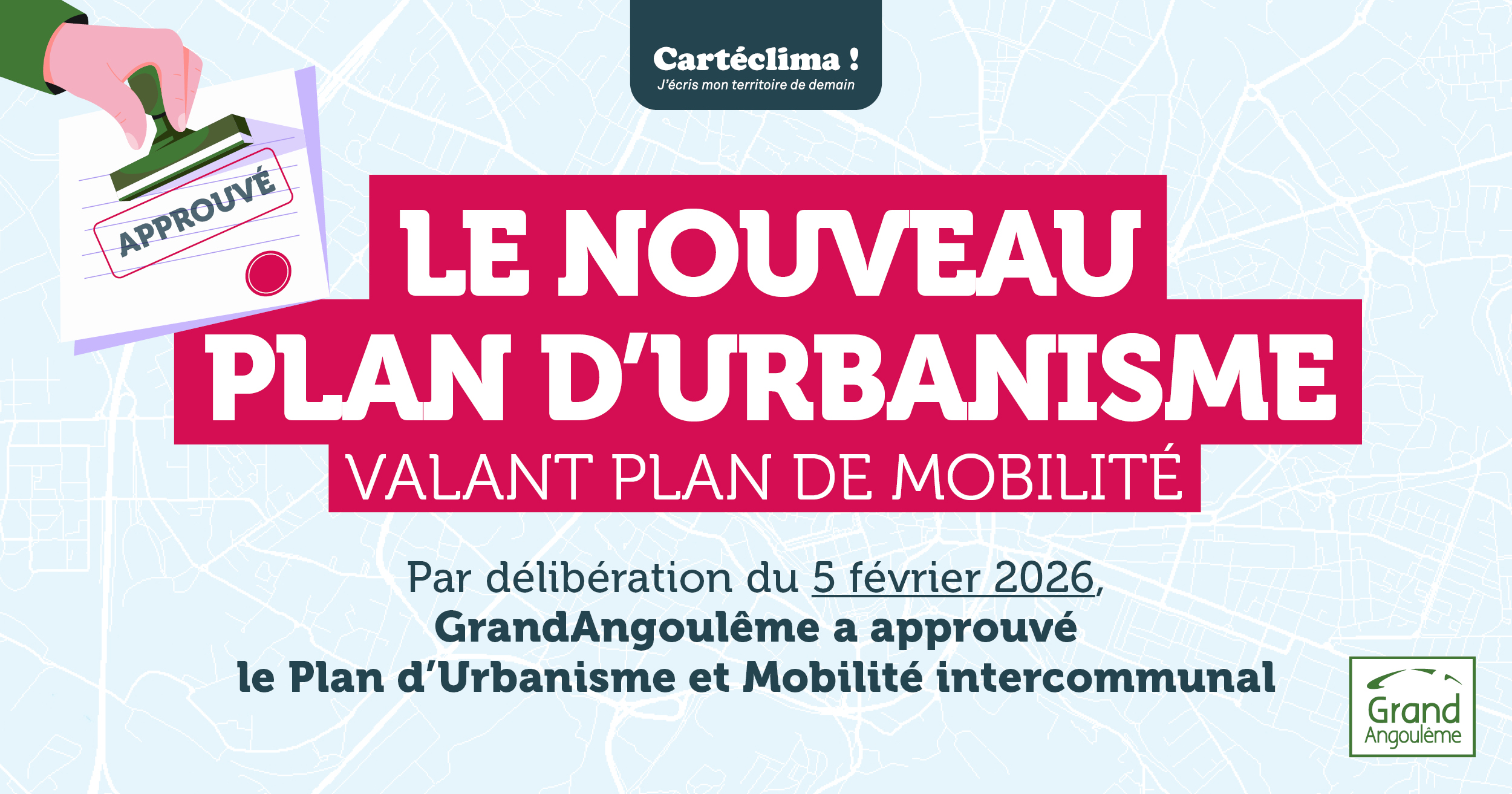 Le 5 février 2026, le Conseil communautaire de GrandAngoulême a approuvé le Plan Local d’Urbanisme intercommunal valant Plan de Mobilités (PLUi-M). Il est entré en vigueur le 27 Février 2026.